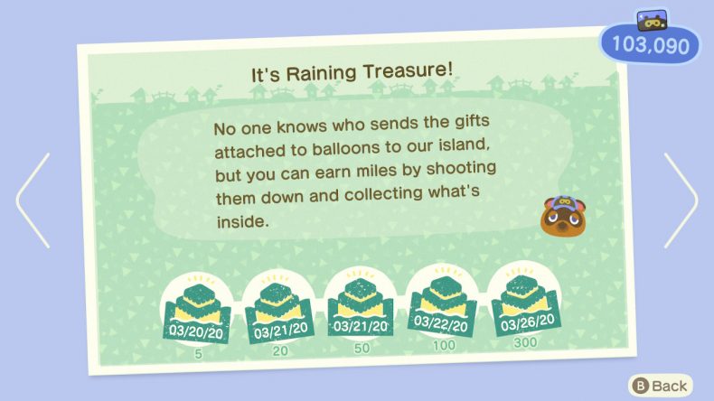 Multiple players have confirmed that refusing to ‘accept’ the “It’s Raining Treasure” Nook Miles achievement by not claiming the rewards doesn’t seem to change anything and balloons will not spawn regardless. (image credit: stellery)