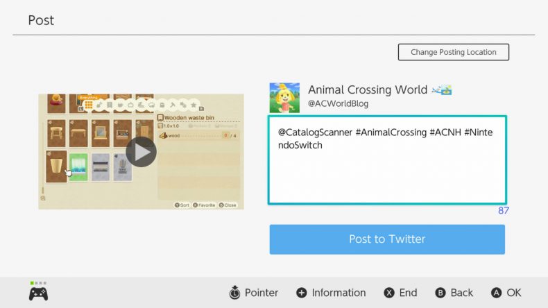 Once the Twitter poster is open on your Nintendo Switch, you need to edit the preset message to have @CatalogScanner in front. This will alert the bot to your video, and ensure the video doesn’t clog your followers’ timelines.