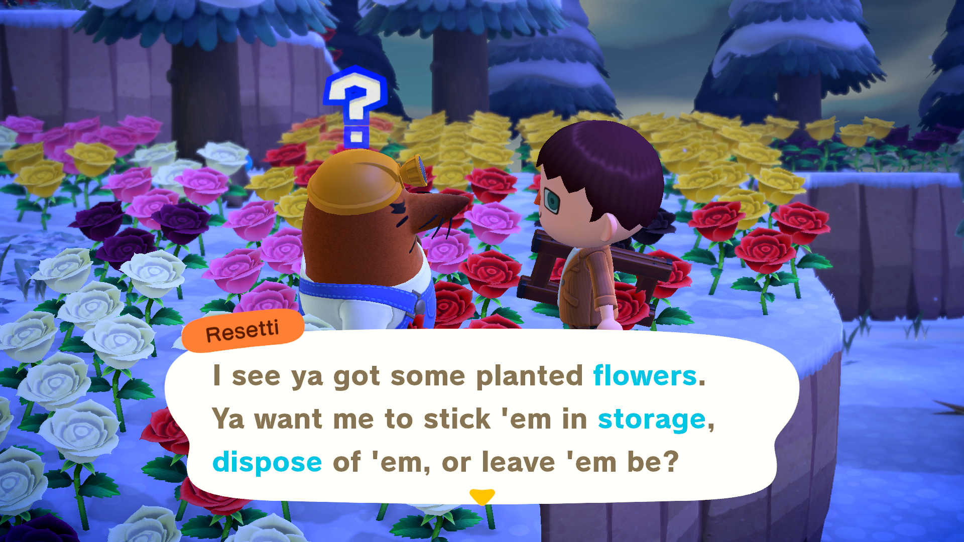 As mentioned above, Resetti will ask your preference for whether flowers and custom designs should be cleared. And in the case of flowers, you can choose between depositing flowers into your house storage or throwing them out entirely.