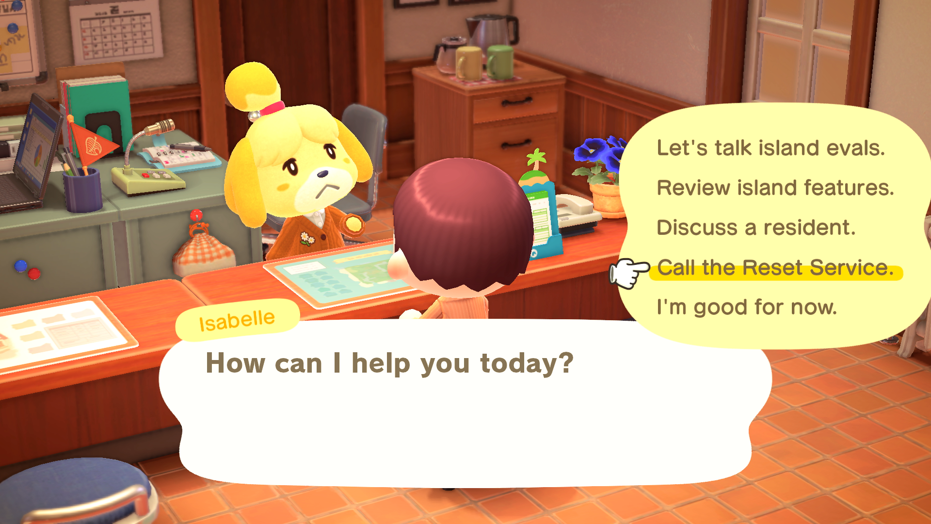 After your first introduction to Resetti, he can summoned onto your island on any non-event day by speaking to Isabelle at Resident Services and selecting ‘Call the Reset Service’. Resetti will then appear at a random location on your island to hunt down!