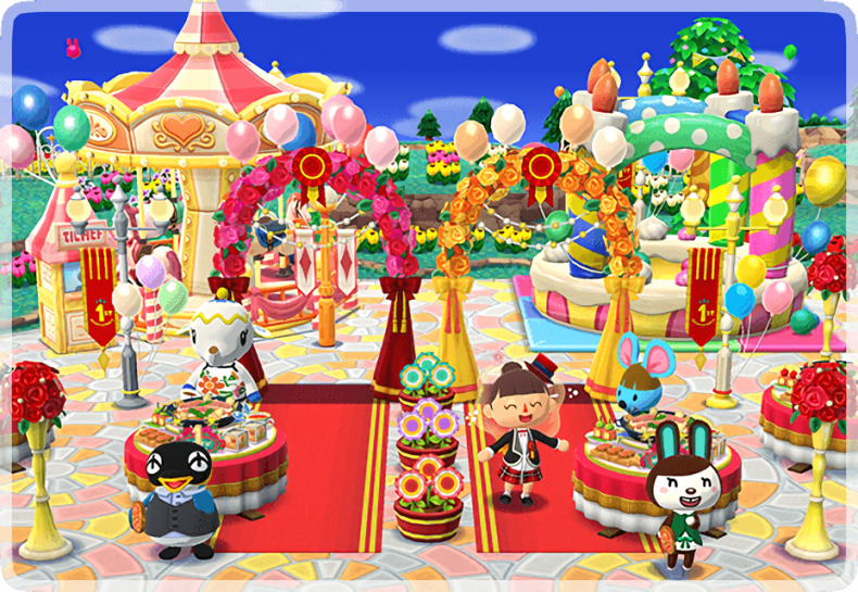 Ready to completely celebrate Pocket Camp’s first anniversary? Make sure to check out the terrain menu for a new set of matching anniversary parts! There’s a balloon filled background, an anniversary middle and foreground, a white iron fence, and a party stage deck.