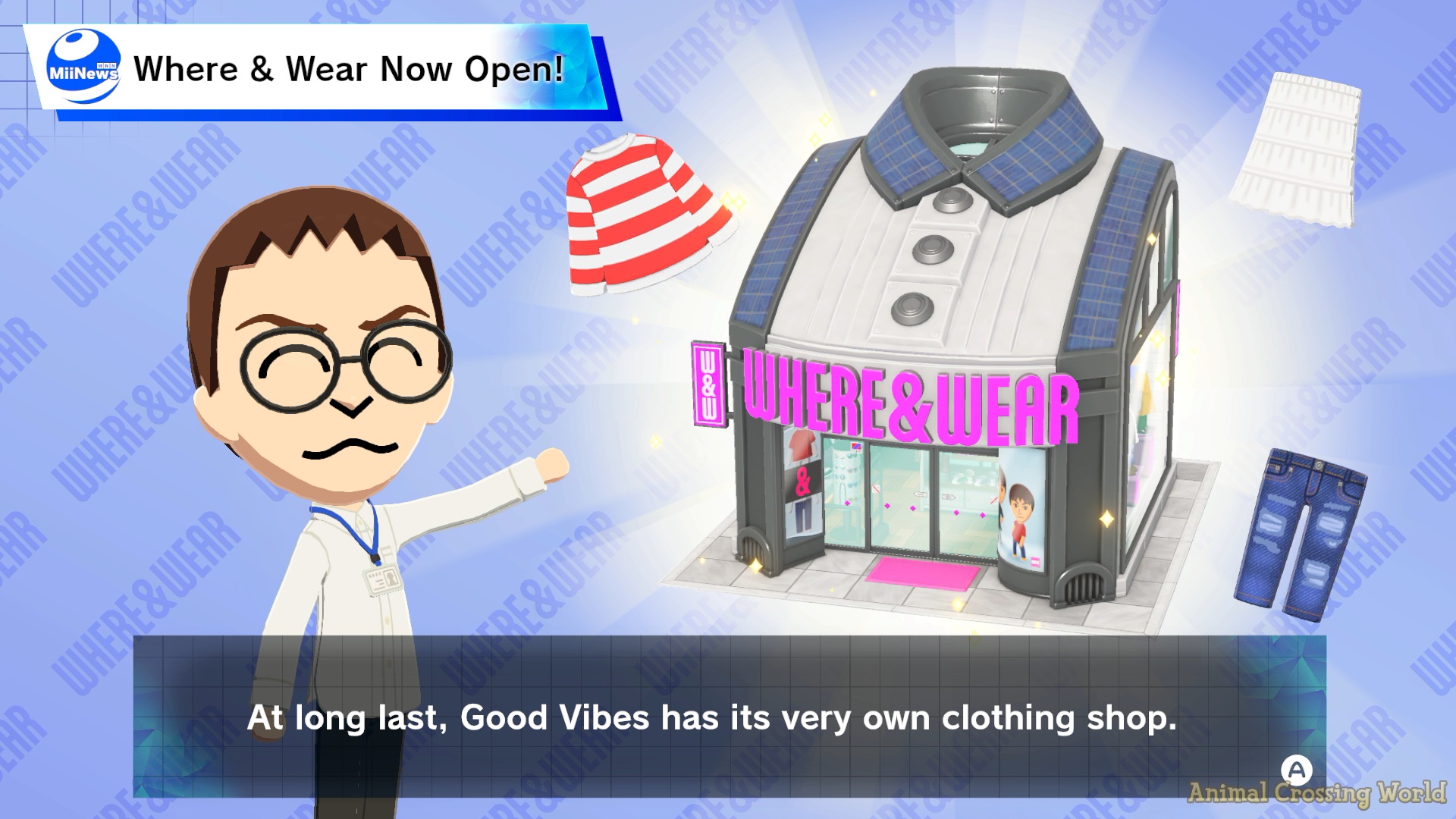 The Where & Wear clothing shop is your island’s third building unlocked after creating three Miis and speaking to a Mii with a yellow bubble showing interest in fashion.